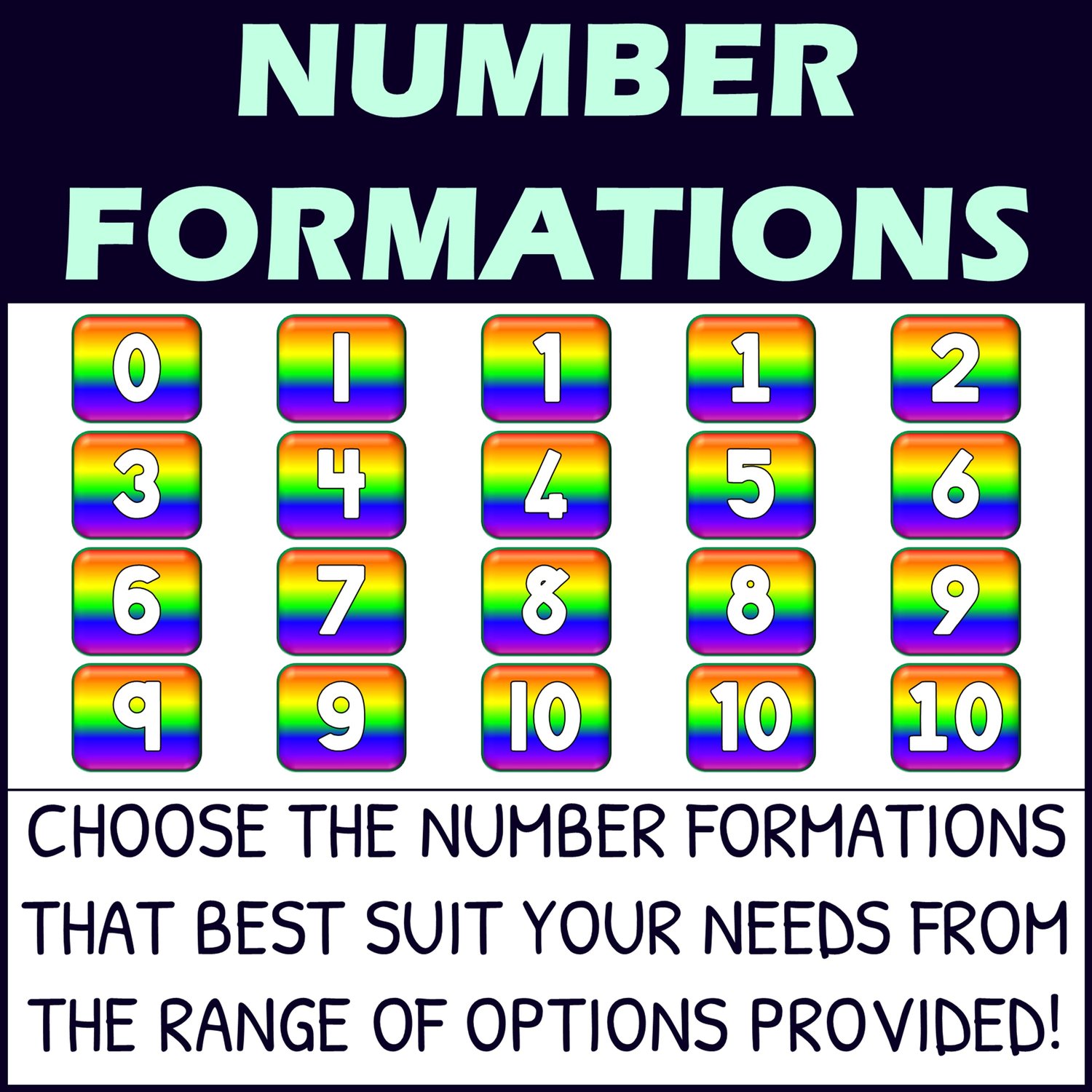 - Different number formations for some of the numbers are included so you can choose which formations suit your needs best!