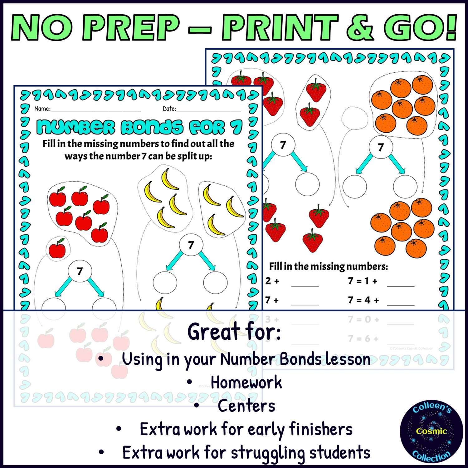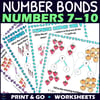 Need an activity for teaching or practicing number bonds to 10 with pictures that will help students to understand the concept better? These easy to use 1st grade Number Bonds Worksheets are great for helping students to visualize numbers and understand how to decompose the numbers 7-10. The simple pictures in these printable math worksheets will help children to develop their numbers sense and grasp the number bonds concept.